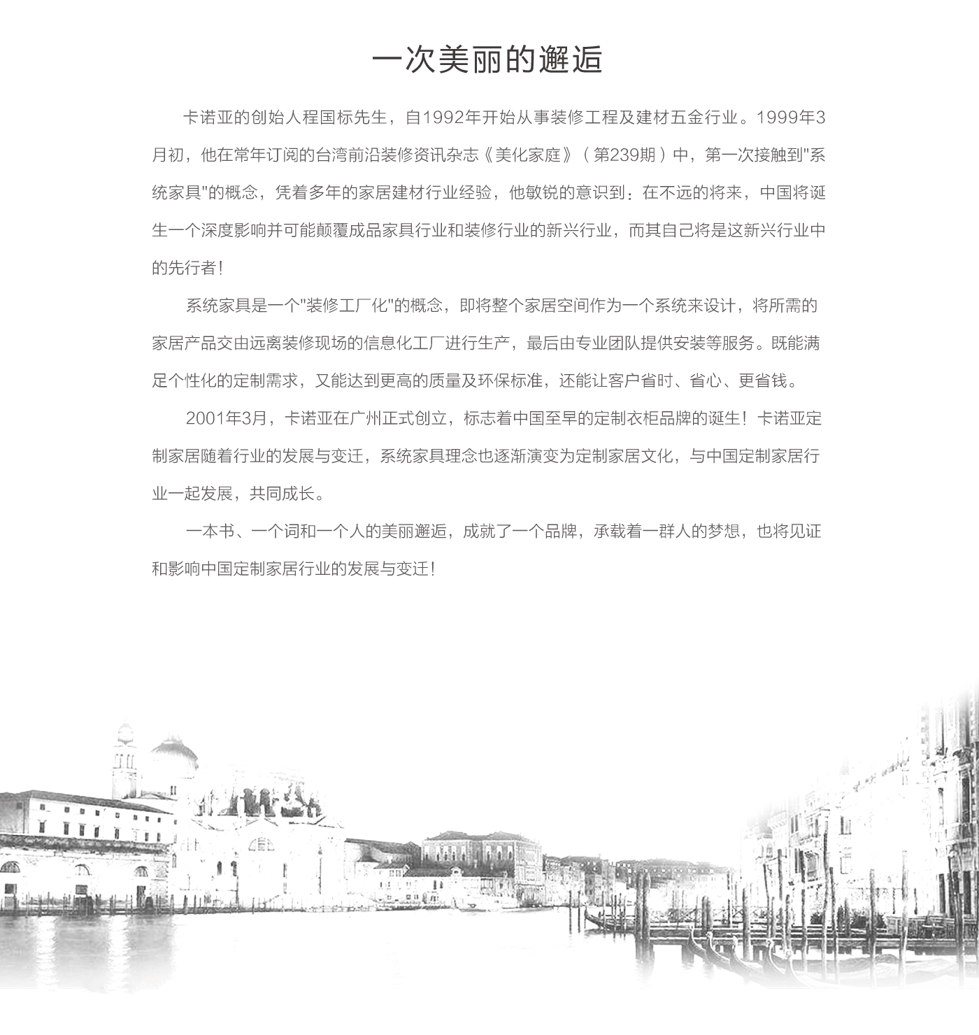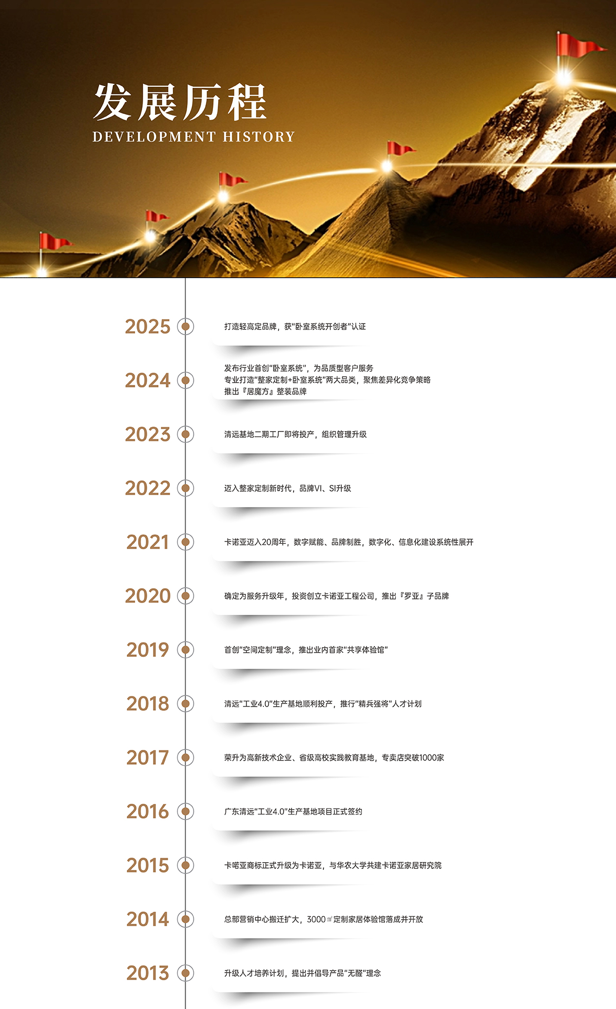 卡諾亞創(chuàng)立于2001年,是集研發(fā)、設(shè)計(jì)、生產(chǎn)和服務(wù)于一體的高新技術(shù)企業(yè)。旗下?lián)碛芯幽Х秸b、卡諾亞高端定制、羅亞全屋定制三大品牌。